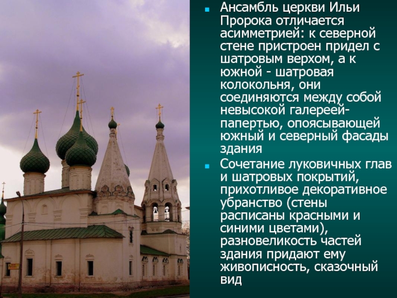 Слайд 14Ансамбль церкви Ильи Пророка отличается асимметрией: к северной стене пристроен