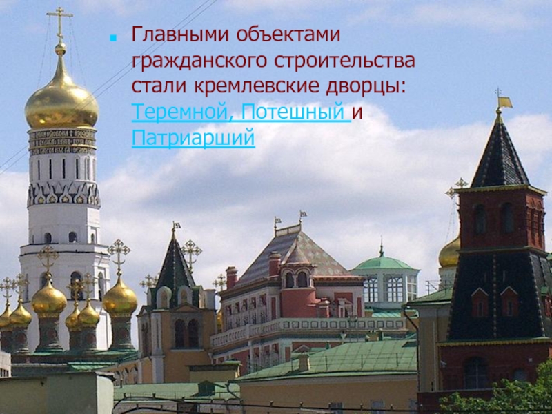 Слайд 4Главными объектами гражданского строительства стали кремлевские дворцы: Теремной, Потешный и