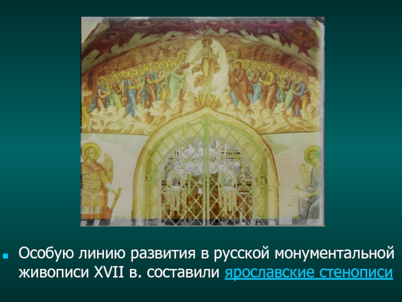 Слайд 37Особую линию развития в русской монументальной живописи XVII в. составили