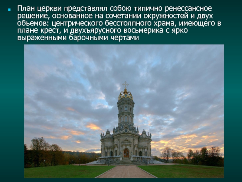 Слайд 32План церкви представлял собою типично ренессансное решение, основанное на сочетании