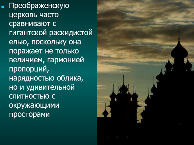 Слайд 20Преображенскую церковь часто сравнивают с гигантской раскидистой елью, поскольку она