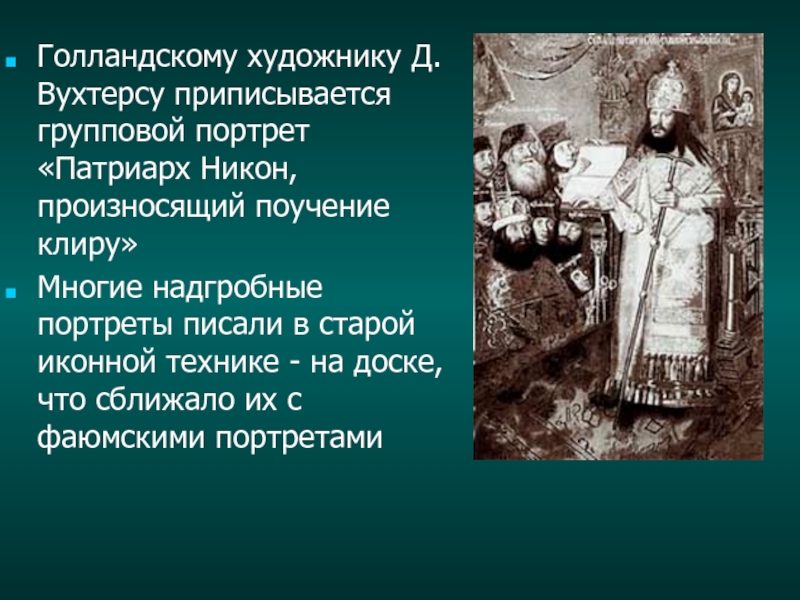 Слайд 42Голландскому художнику Д.Вухтерсу приписывается групповой портрет «Патриарх Никон, произносящий поучение