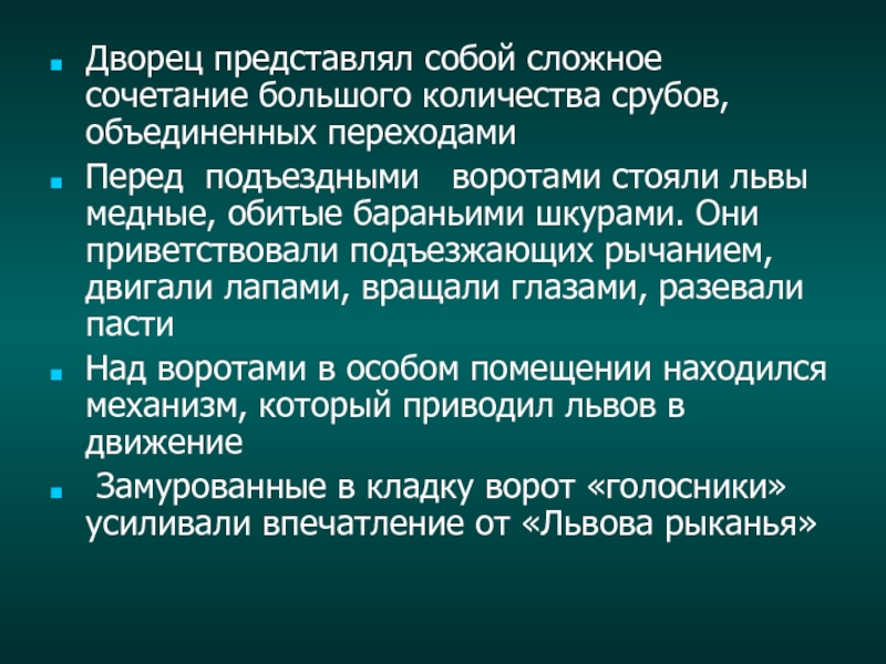 Слайд 25Дворец представлял собой сложное сочетание большого количества срубов, объединенных переходами