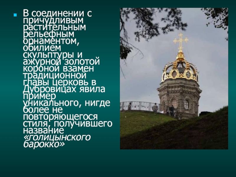пример уникального, нигде более не повторяющегося стиля, получившего название «голицынского барокко»