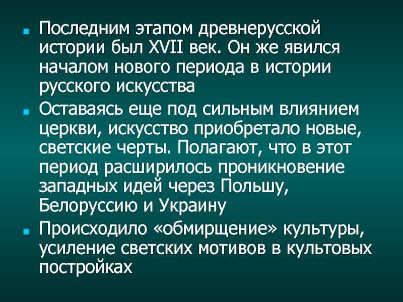 влиянием церкви, искусство приобретало новые, светские черты. Полагают, что в этот период расширилось проникновение западных идей через Польшу, Белоруссию и Украину