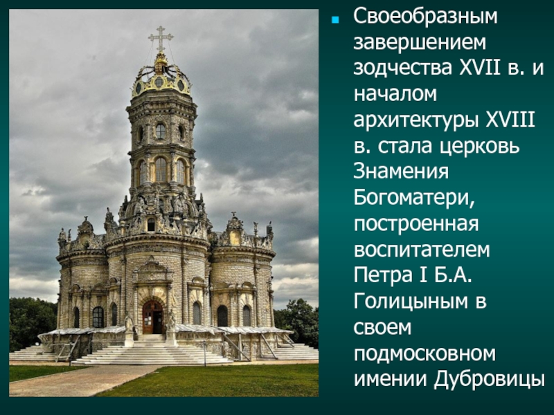 Слайд 31Своеобразным завершением зодчества XVII в. и началом архитектуры XVIII в.