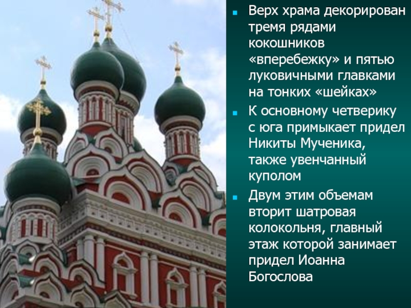 Слайд 7Верх храма декорирован тремя рядами кокошников «вперебежку» и пятью луковичными