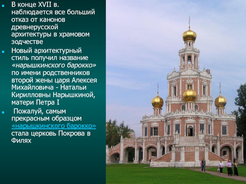 Пожалуй, самым прекрасным образцом «нарышкинского барокко» стала церковь Покрова в Филях