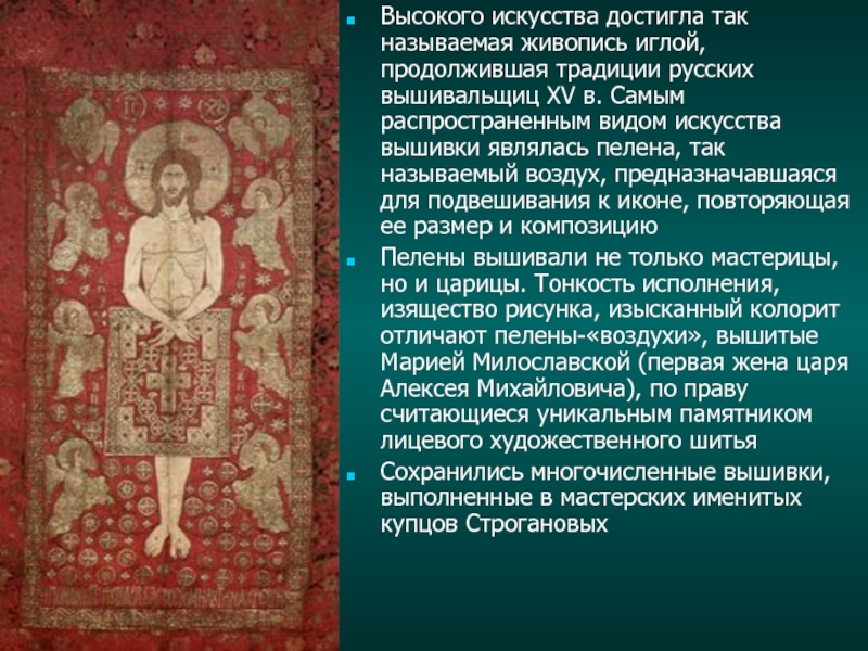 Слайд 43Высокого искусства достигла так называемая живопись иглой, продолжившая традиции русских