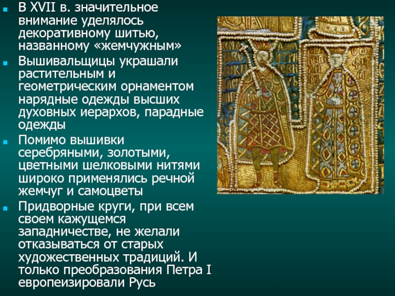 Слайд 44В XVII в. значительное внимание уделялось декоративному шитью, названному «жемчужным»