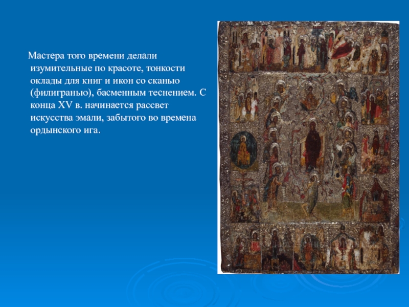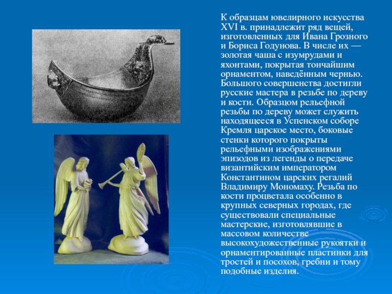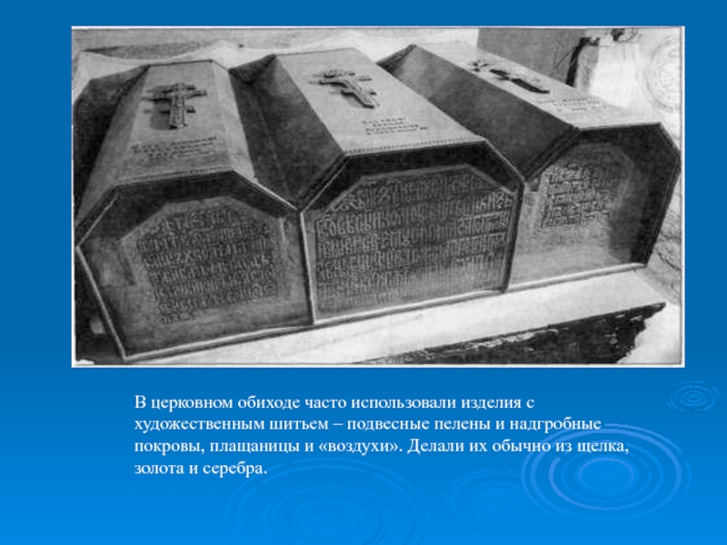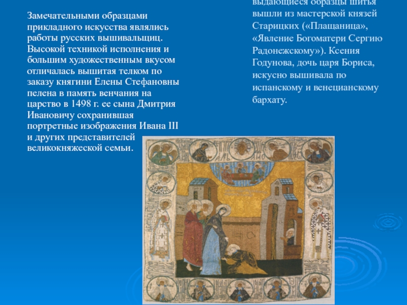 Замечательными образцами прикладного искусства являлись работы русских вышивальщиц. Высокой техникой исполнения и большим художественным вкусом отличалась вышитая телком по заказу княгини Елены Стефановны пелена в память венчания на царство в 1498 г. ее сына Дмитрия Ивановичу сохранившая портретные изображения Ивана III и других представителей великокняжеской семьи.