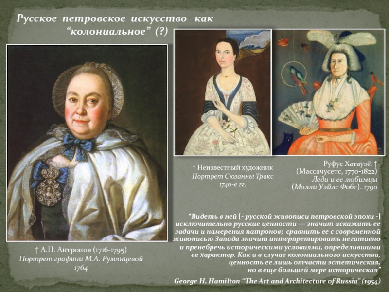 “Видеть в ней [- русской живописи петровской эпохи -] исключительно русские ценности — значит искажать ее задачи и намерения патронов; сравнить ее с современной живописью Запада значит интерпретировать негативно