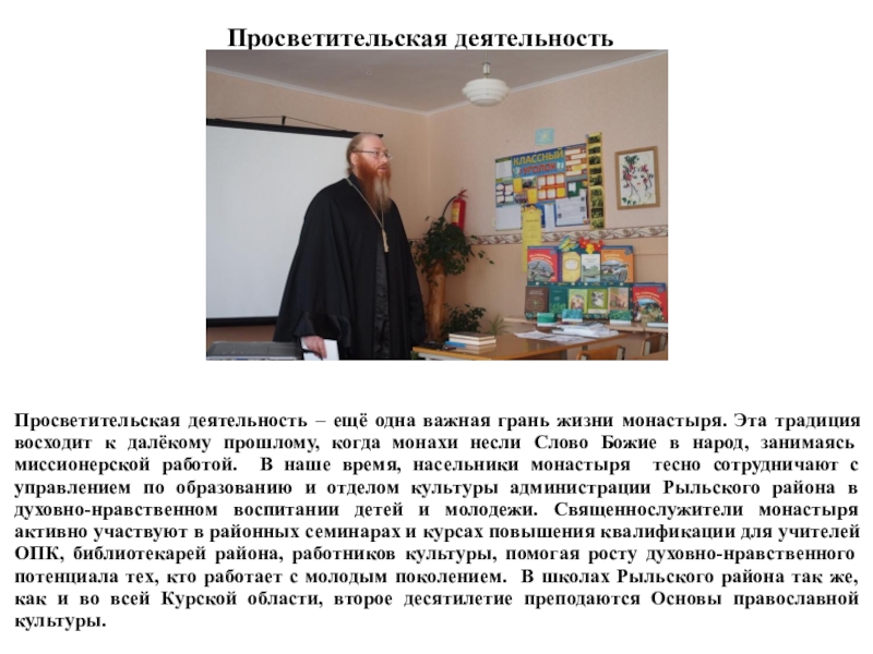 При Рыльском Свято-Николаевском мужском монастыре на территории Рыльского района организованы пять скитов: Покровский скит с. Боброво, Никольский скит с. Макеево, Успенский скит с. Волобуево, скит с. Тимохино, скит Рождества Пресвятой Богородицы с. Коренское.