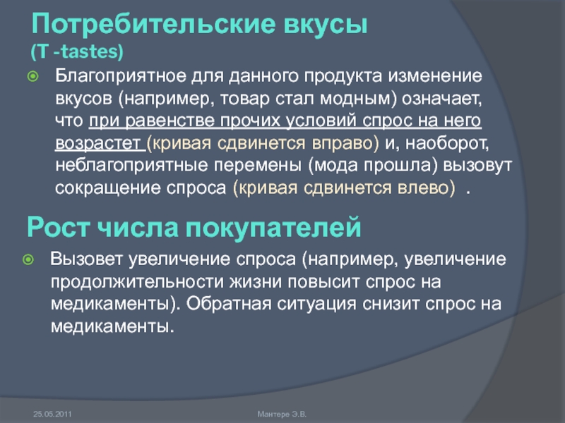 Вызовет увеличение спроса (например, увеличение продолжительности жизни повысит спрос на медикаменты). Обратная ситуация снизит спрос на медикаменты.