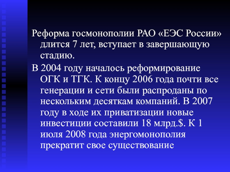 Слайд 27Реформа госмонополии РАО «ЕЭС России» длится 7 лет, вступает в