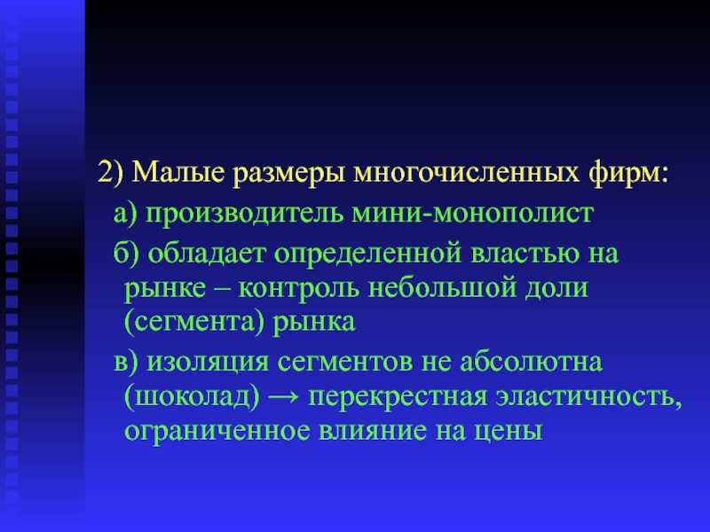 в) изоляция сегментов не абсолютна (шоколад) → перекрестная эластичность, ограниченное влияние на цены