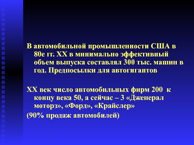 ХХ век число автомобильных фирм 200 к концу века 50, а сейчас – 3 «Дженерал моторз», «Форд», «Крайслер»