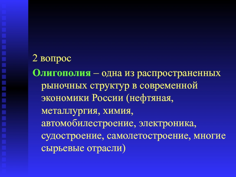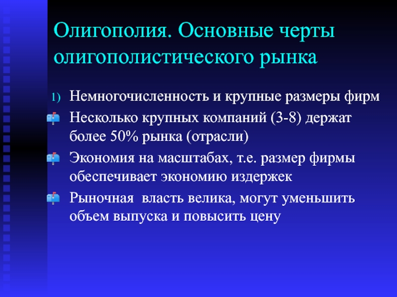 Слайд 12Олигополия. Основные черты олигополистического рынка
