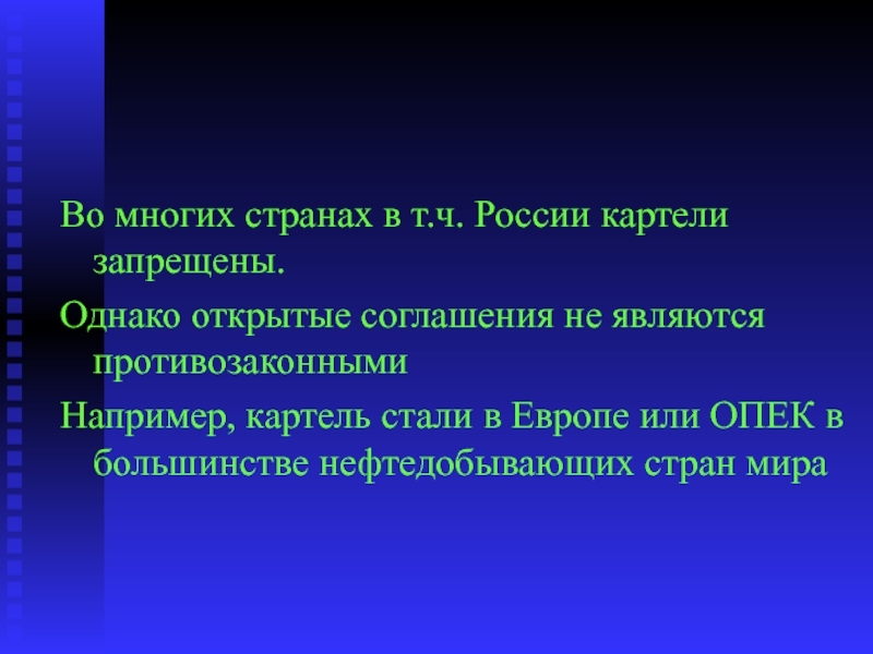 Слайд 17Во многих странах в т.ч. России картели запрещены.