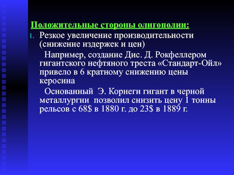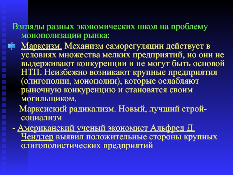 - Американский ученый экономист Альфред Д.Чендлер выявил положительные стороны крупных олигополистических предприятий