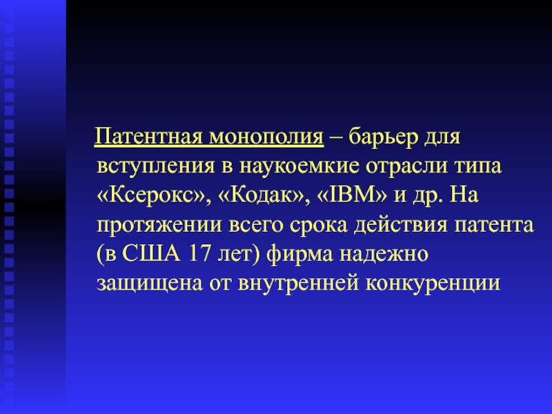 Слайд 22 Патентная монополия – барьер для вступления в наукоемкие