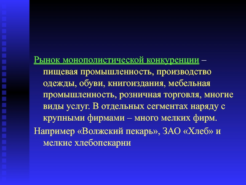 Слайд 4Рынок монополистической конкуренции – пищевая промышленность, производство одежды, обуви, книгоиздания,