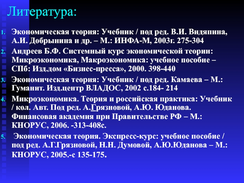 Экономическая теория. Экспресс-курс: учебное пособие / под ред. А.Г.Грязновой, Н.Н. Думовой, А.Ю.Юданова – М.: КНОРУС, 2005.-с 135-175.