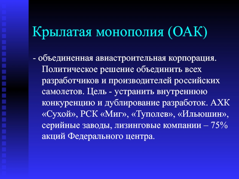 и дублирование разработок. АХК «Сухой», РСК «Миг», «Туполев», «Ильюшин», серийные заводы, лизинговые компании – 75% акций Федерального центра.