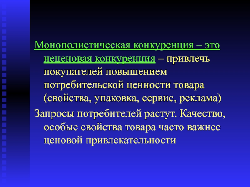 Слайд 8Монополистическая конкуренция – это неценовая конкуренция – привлечь покупателей повышением