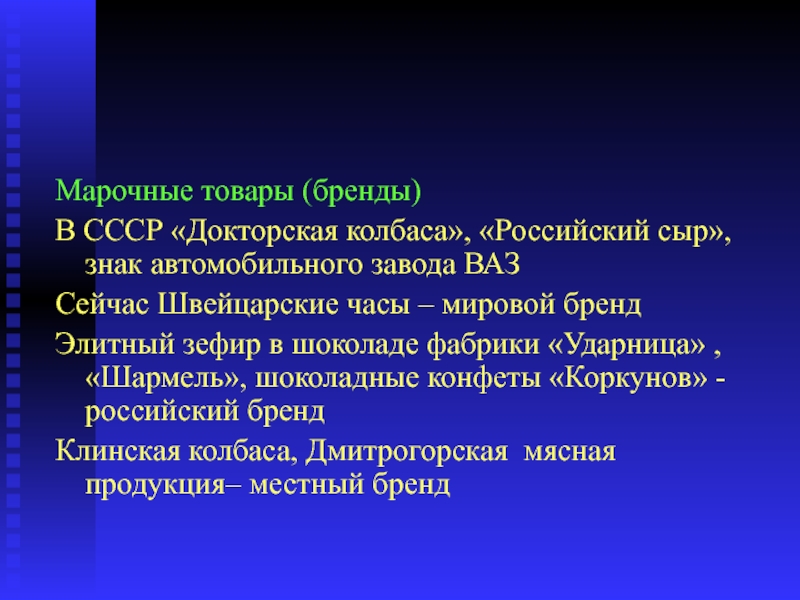 В СССР «Докторская колбаса», «Российский сыр», знак автомобильного