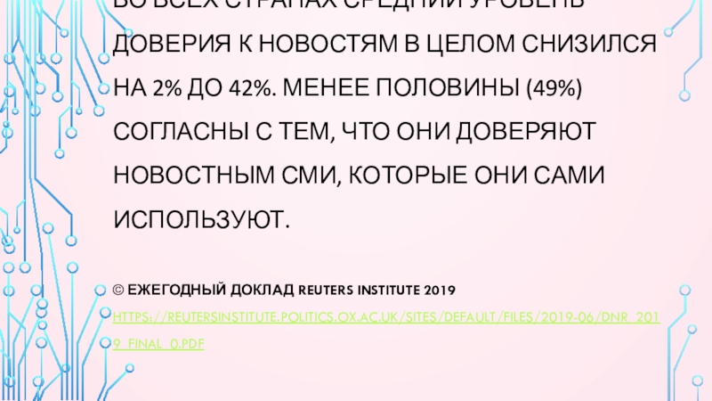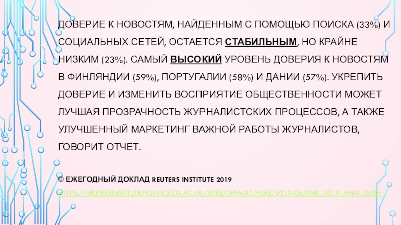доверия к новостям в Финляндии (59%), Португалии (58%) и Дании (57%). Укрепить доверие и изменить восприятие общественности может лучшая прозрачность журналистских процессов, а также улучшенный маркетинг важной работы журналистов, говорит отчет.