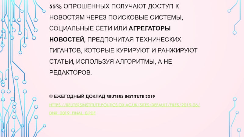 Слайд 555% опрошенных получают доступ к новостям через поисковые системы, социальные