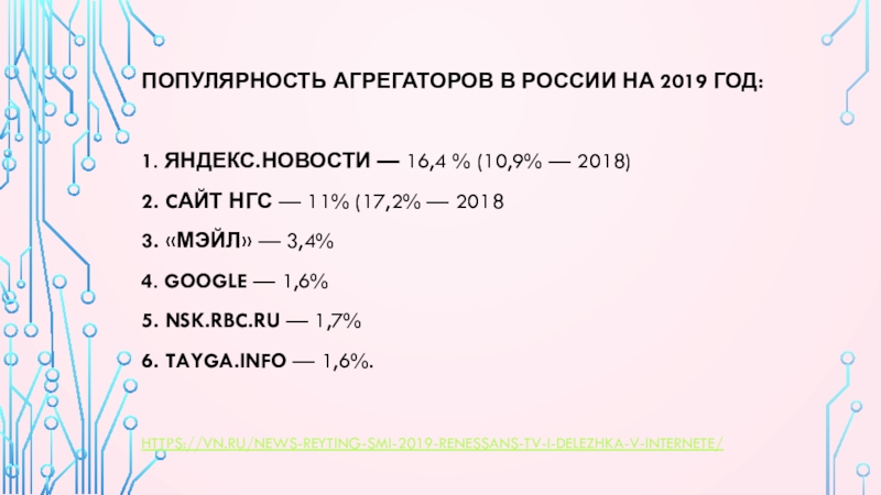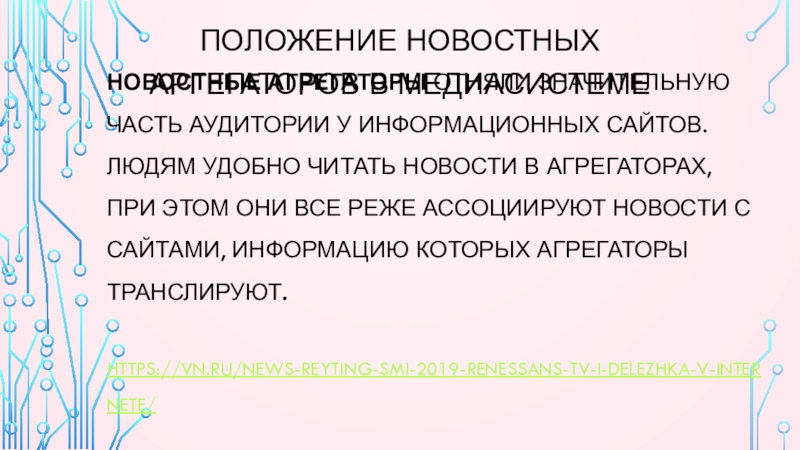 Слайд 7Новостные агрегаторы отняли значительную часть аудитории у информационных сайтов. Людям