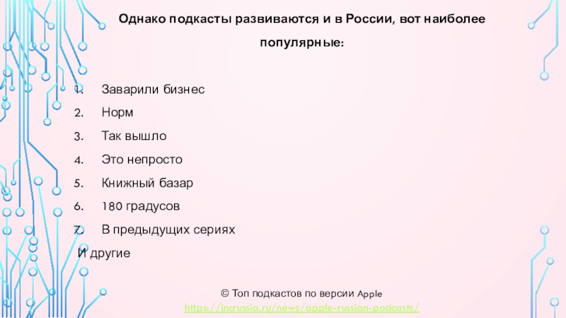 Слайд 24Однако подкасты развиваются и в России, вот наиболее популярные: