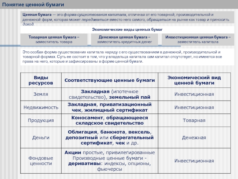 Ценная бумага — это форма существования капитала, отличная от его товарной, производительной и денежной форм, которая может передаваться вместо него самого, обращаться на рынке как товар и приносить доход.
