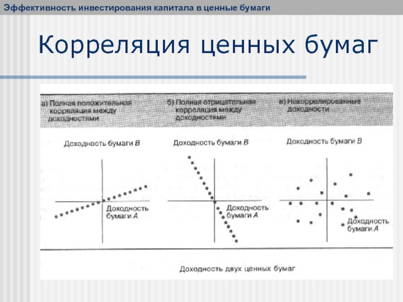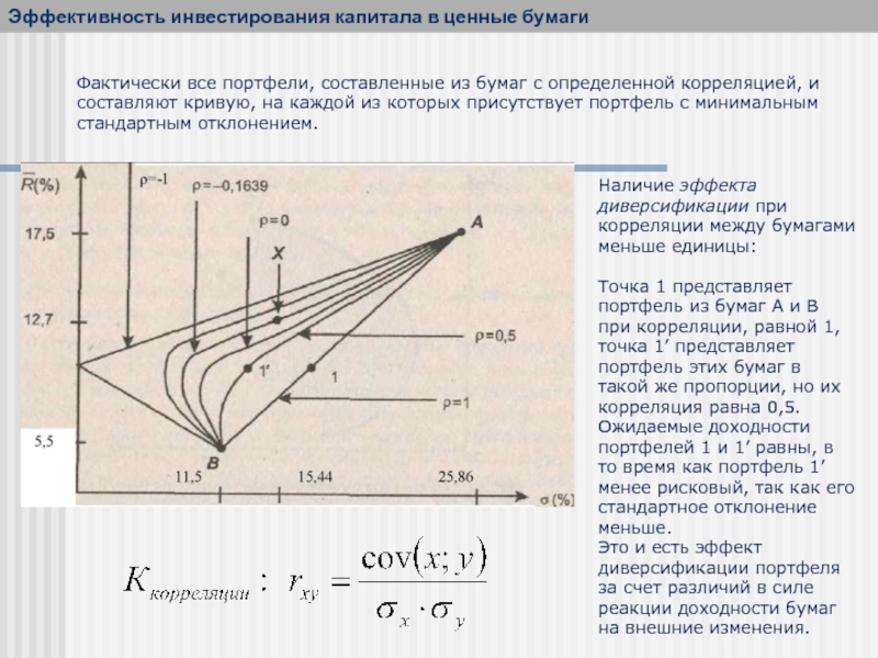 Точка 1 представляет портфель из бумаг А и В при корреляции, равной 1, точка 1’ представляет портфель этих бумаг в такой же пропорции, но их корреляция равна 0,5. Ожидаемые доходности портфелей 1 и 1’ равны, в то время как портфель 1’ менее рисковый, так как его стандартное отклонение меньше.