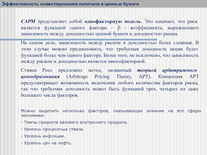 Согласно уравнению АРТ на изменение стоимости актива влияют не только рыночный фактор (стоимость рыночного портфеля), но и другие, в том числе нерыночные, факторы риска — курс национальной валюты, стоимость энергоносителей, уровень инфляции и безработицы и т. д.