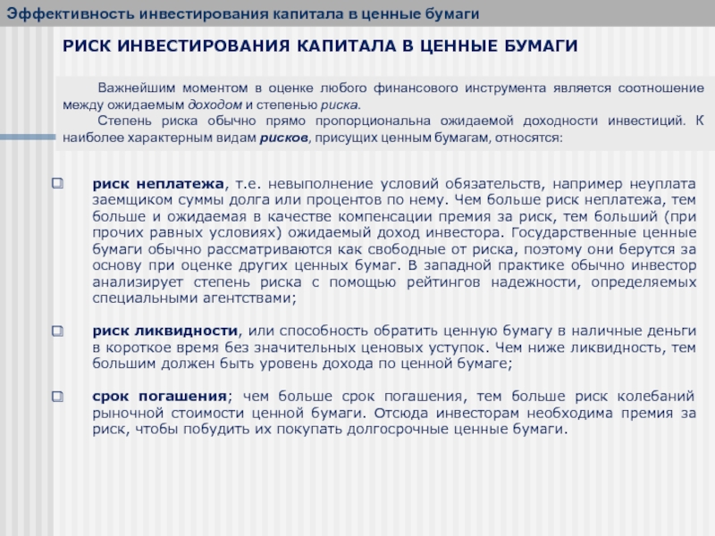 Важнейшим моментом в оценке любого финансового инструмента является соотношение между ожидаемым доходом и степенью риска.