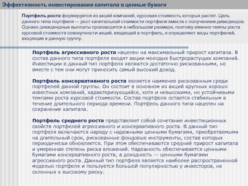Портфель роста формируется из акций компаний, курсовая стоимость которых растет. Цель данного типа портфеля — рост капитальной стоимости портфеля вместе с получением дивидендов. Однако дивидендные выплаты производятся в небольшом размере, поэтому именно темпы роста курсовой стоимости совокупности акций, входящей в портфель, и определяют виды портфелей, входящие в данную группу.
