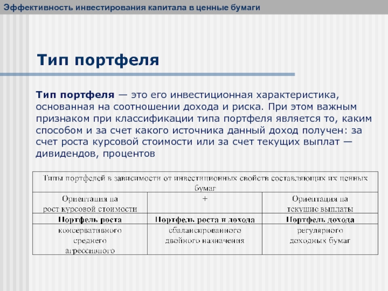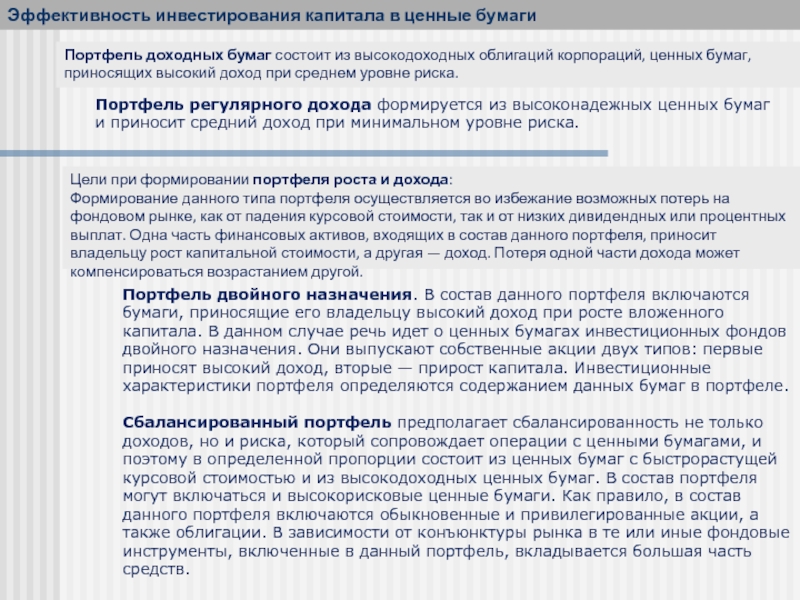 Портфель двойного назначения. В состав данного портфеля включаются бумаги, приносящие его владельцу высокий доход при росте вложенного капитала. В данном случае речь идет о ценных бумагах инвестиционных фондов двойного назначения. Они выпускают собственные акции двух типов: первые приносят высокий доход, вторые — прирост капитала. Инвестиционные характеристики портфеля определяются содержанием данных бумаг в портфеле.