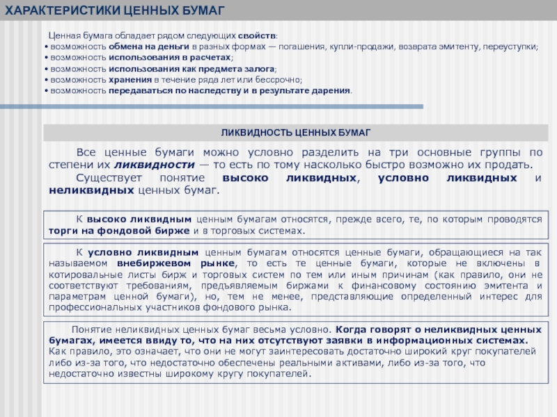 Существует понятие высоко ликвидных, условно ликвидных и неликвидных ценных бумаг.