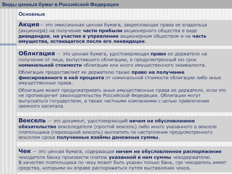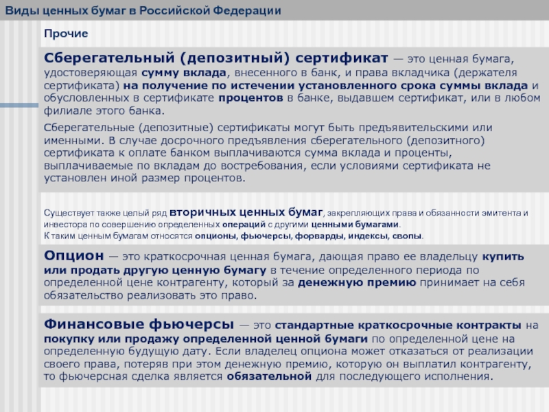 Существует также целый ряд вторичных ценных бумаг, закрепляющих права и обязанности эмитента и инвестора по совершению определенных операций с другими ценными бумагами.