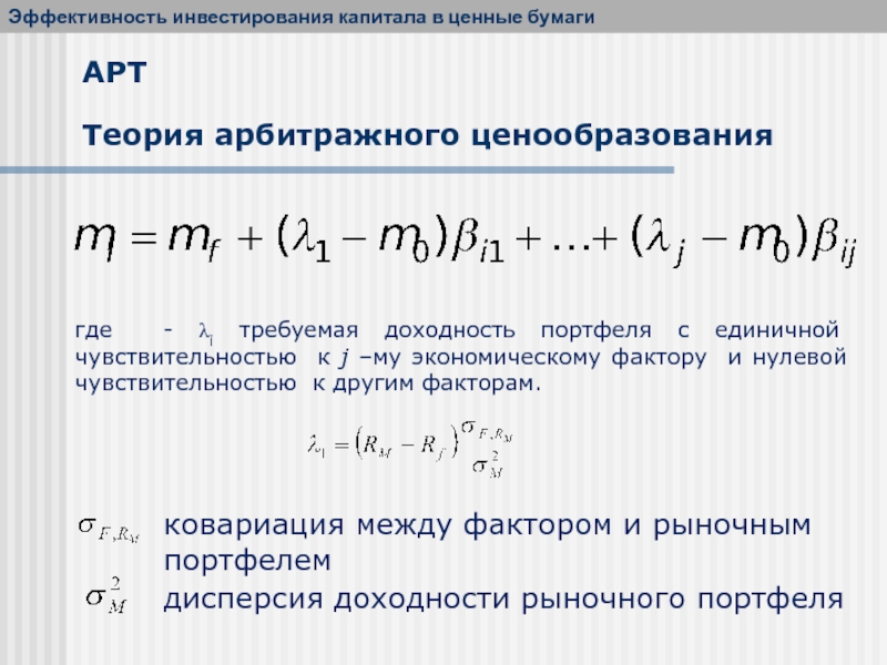 3) арбитражный портфель не чувствителен ни к каким рыночным факторам, соответственно для любого фактора k. В рамках APT чувствительность i-той бумаги к k-тому фактору будет обозначаться bik.