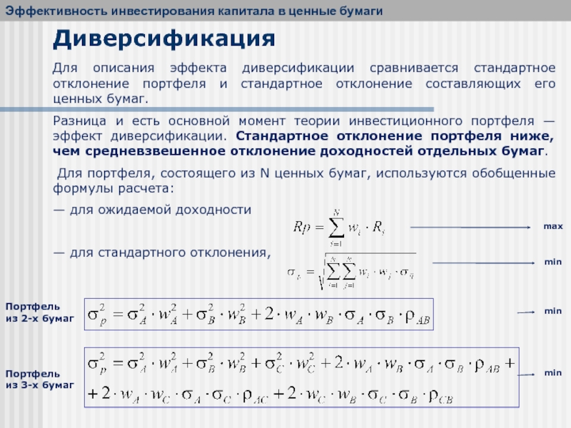 Наличие эффекта диверсификации при корреляции между бумагами меньше единицы: