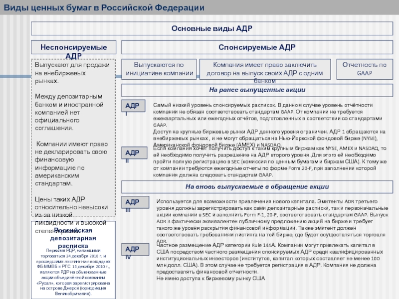 Частное размещение АДР категории Rule 144А. Компании могут привлекать капитал в США посредством частного размещения спонсируемых АДР среди квалифицированных институциональных инвесторов (институтов, капитал которых составляет не менее 100 млн долл. США). В этом случае не требуется регистрация в АДР. Компания не должна предоставлять финансовой отчетности.