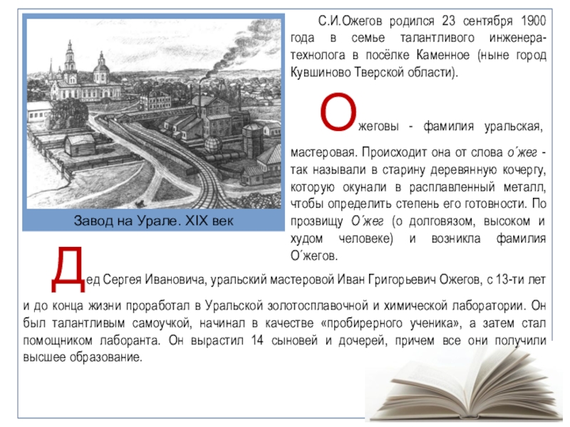 проработал в Уральской золотосплавочной и химической лаборатории. Он был талантливым самоучкой, начинал в качестве «пробирерного ученика», а затем стал помощником лаборанта. Он вырастил 14 сыновей и дочерей, причем все они получили высшее образование.С.И.Ожегов родился 23 сентября 1900 года в семье талантливого инженера-технолога в посёлке Каменное (ныне город Кувшиново Тверской области).