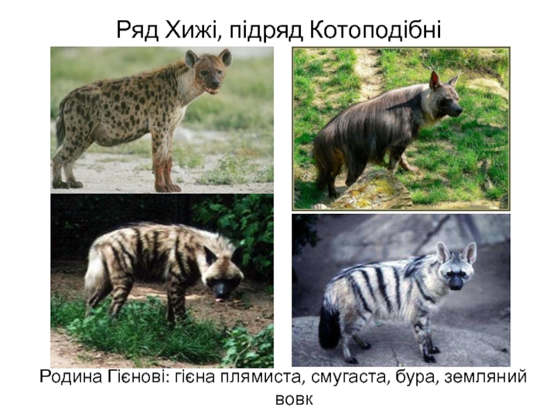 Родина Гієнові: гієна плямиста, смугаста, бура,