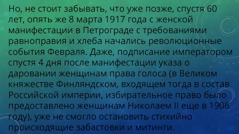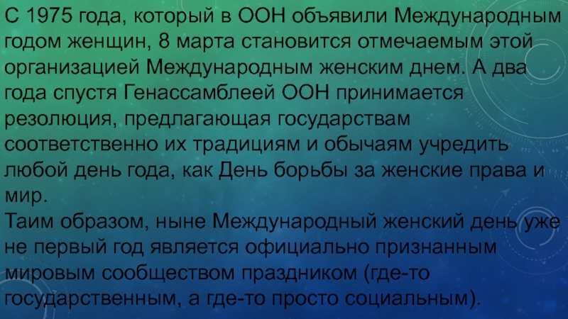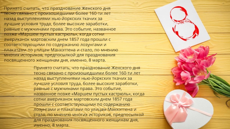 Принято считать, что празднование Женского дня тесно связано с произошедшими более 160-ти лет назад выступлениями нью-йоркских ткачих за лучшие условия труда, более высокие заработки, равные с мужчинами права. Это событие, названное позже «Маршем пустых кастрюль», когда сотни американок мартовским днем 1857 года прошли с соответствующими по содержанию лозунгами и плакатами по улицам Манхэттена и стало, по мнению многих историков, предпосылкой для празднования посвященного женщинам дня, именно, 8 марта.