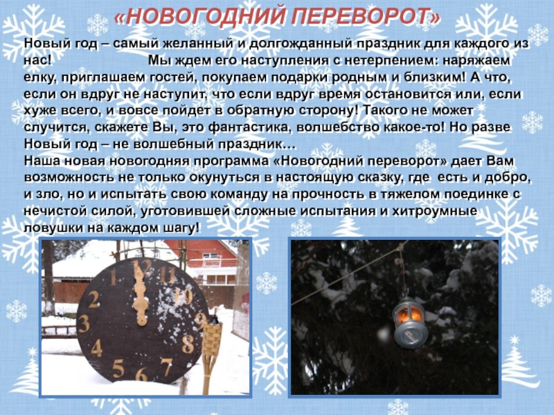 Наша новая новогодняя программа «Новогодний переворот» дает Вам возможность не только окунуться в настоящую сказку, где есть и добро, и зло, но и испытать свою команду на прочность в тяжелом поединке с нечистой силой, уготовившей сложные испытания и хитроумные ловушки на каждом шагу!