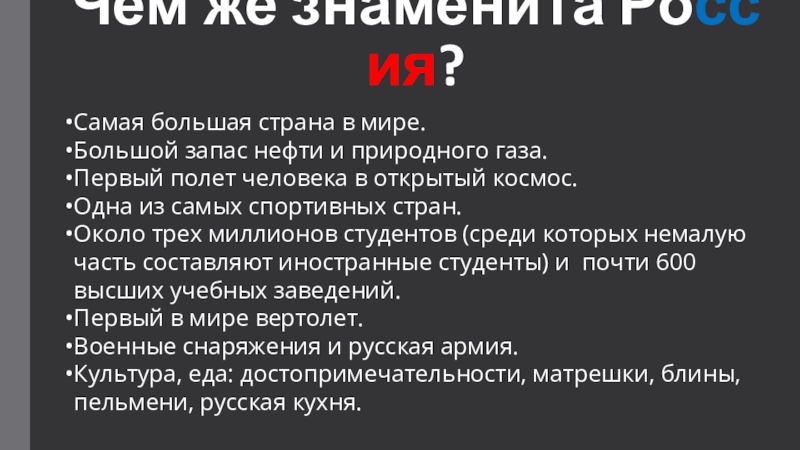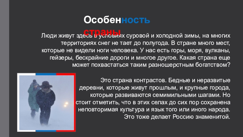 Это страна контрастов. Бедные и неразвитые деревни, которые живут прошлым, и крупные города, которые развиваются семимильными шагами. Но стоит отметить, что в этих селах до сих пор сохранена неповторимая культура и язык того или иного народа. Это тоже делает Россию знаменитой.